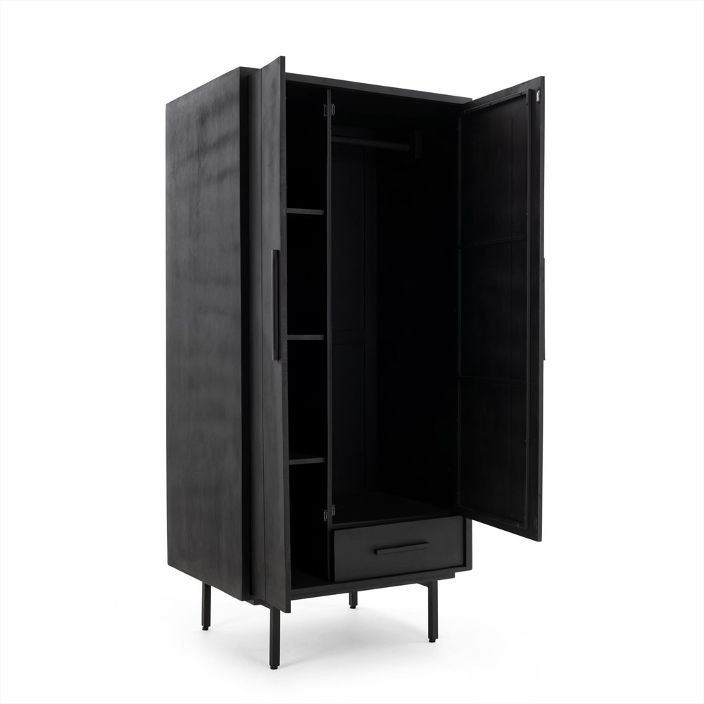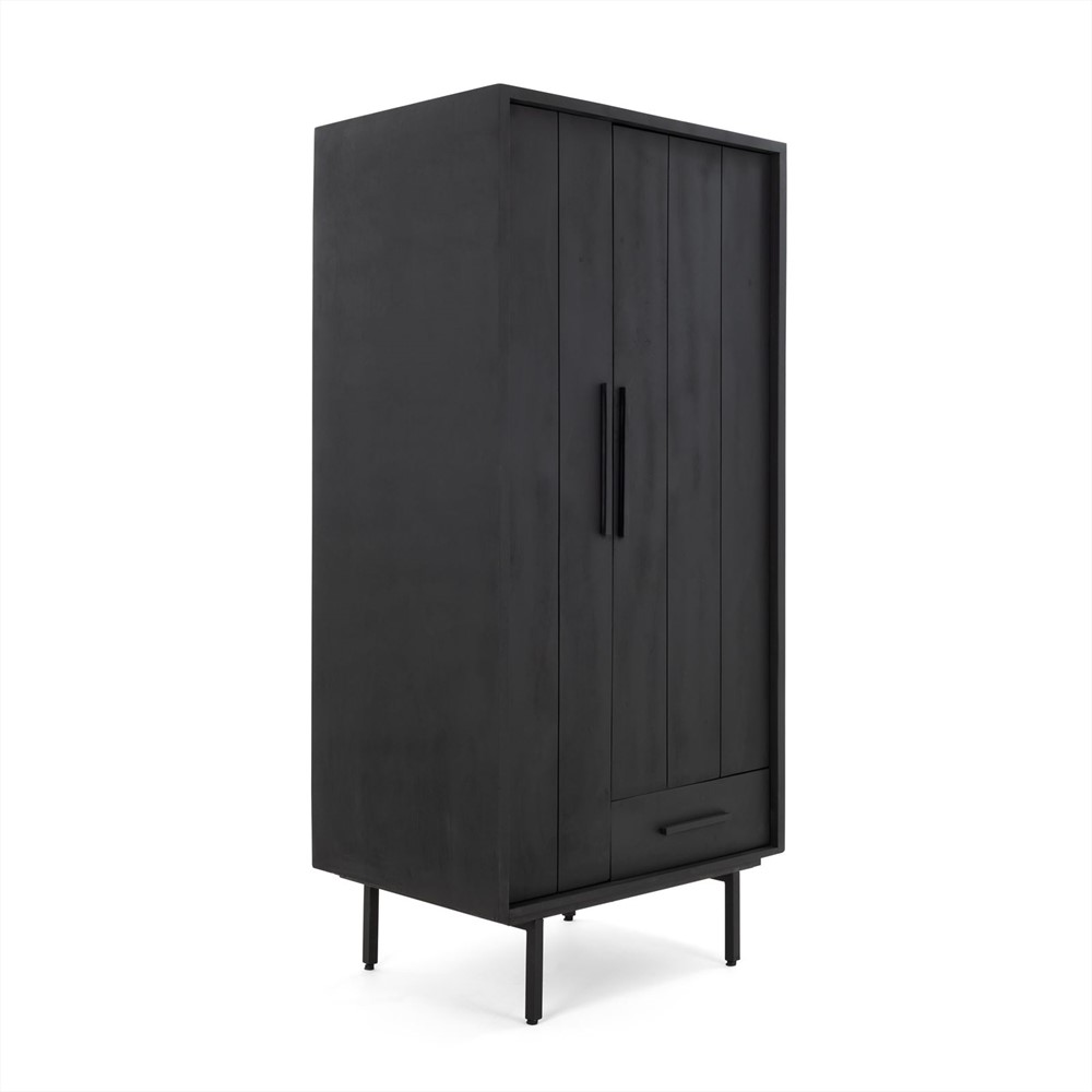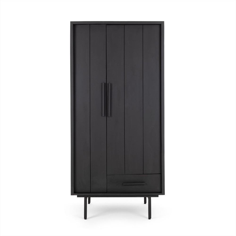 De Garderobe Kast zwart 185cm biedt voldoende opbergruimte voor kleding, accessoires of andere spullen die je graag uit het zicht wilt houden. Het open vak bovenin is ideaal voor het neerzetten van decoratieve items of het opbergen van boeken. De ene kant van de kast heeft een smalle deur en de andere kant heeft een lade, waardoor je eenvoudig kunt kiezen hoe je je spullen wilt opbergen.