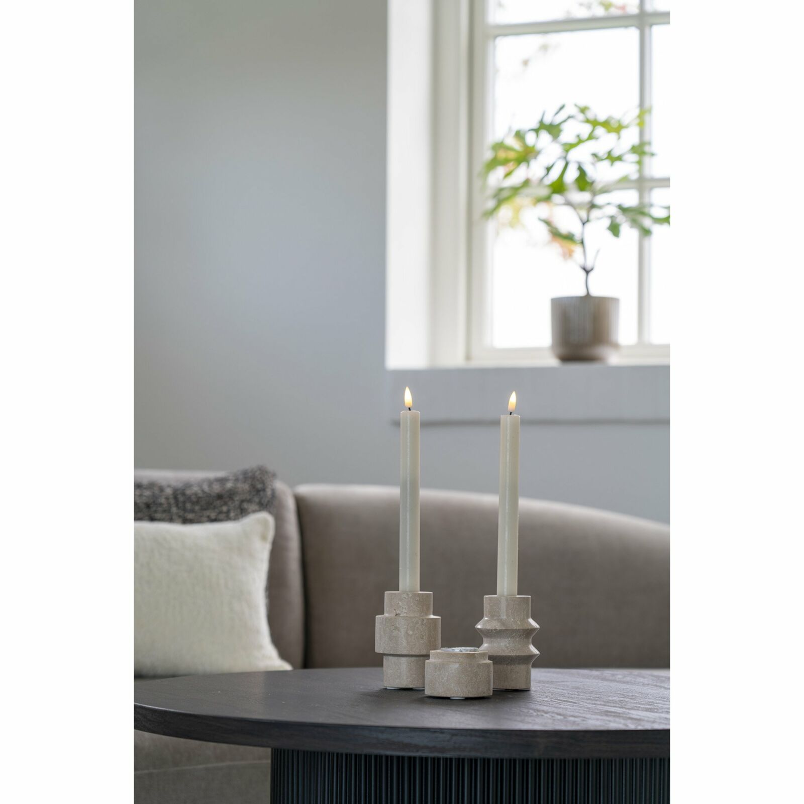 Deze theelichthouderset van travertijn
